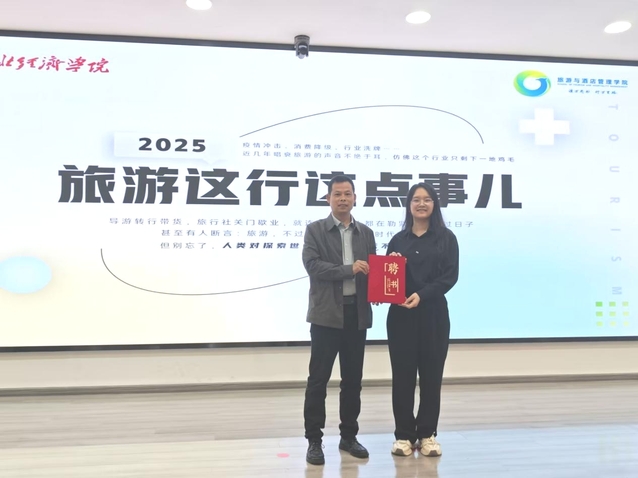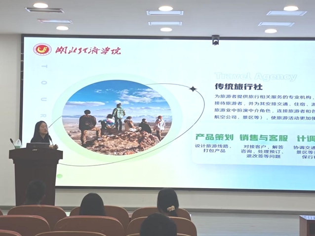 会上,林小莉结合自身学习及从事旅游行业的实践经历,以“旅游这行这点事儿”为主题,从老员工活、行业现状、行业领域、行业发展四个维度展开分享。在职业方向上,她详细解析了产品策划、计调、导游、旅游数据分析、景区运营等岗位的职责与能力要求,并结合武汉地区薪资参考数据,为员工职业规划提供了直观参考。互动环节中,林小莉针对同学提出的“多语种导游现状”的问题结合实际案例给出了细致的解答,帮助同学了解行业前沿信息。最后,她以“行千里,致广大”寄语2025级旅游管理专业员工,希望同学们以专业为舟,以热爱为帆,在旅游行业的广阔天地中探索边界、深耕领域,实现职业的价值与人生的成长。
