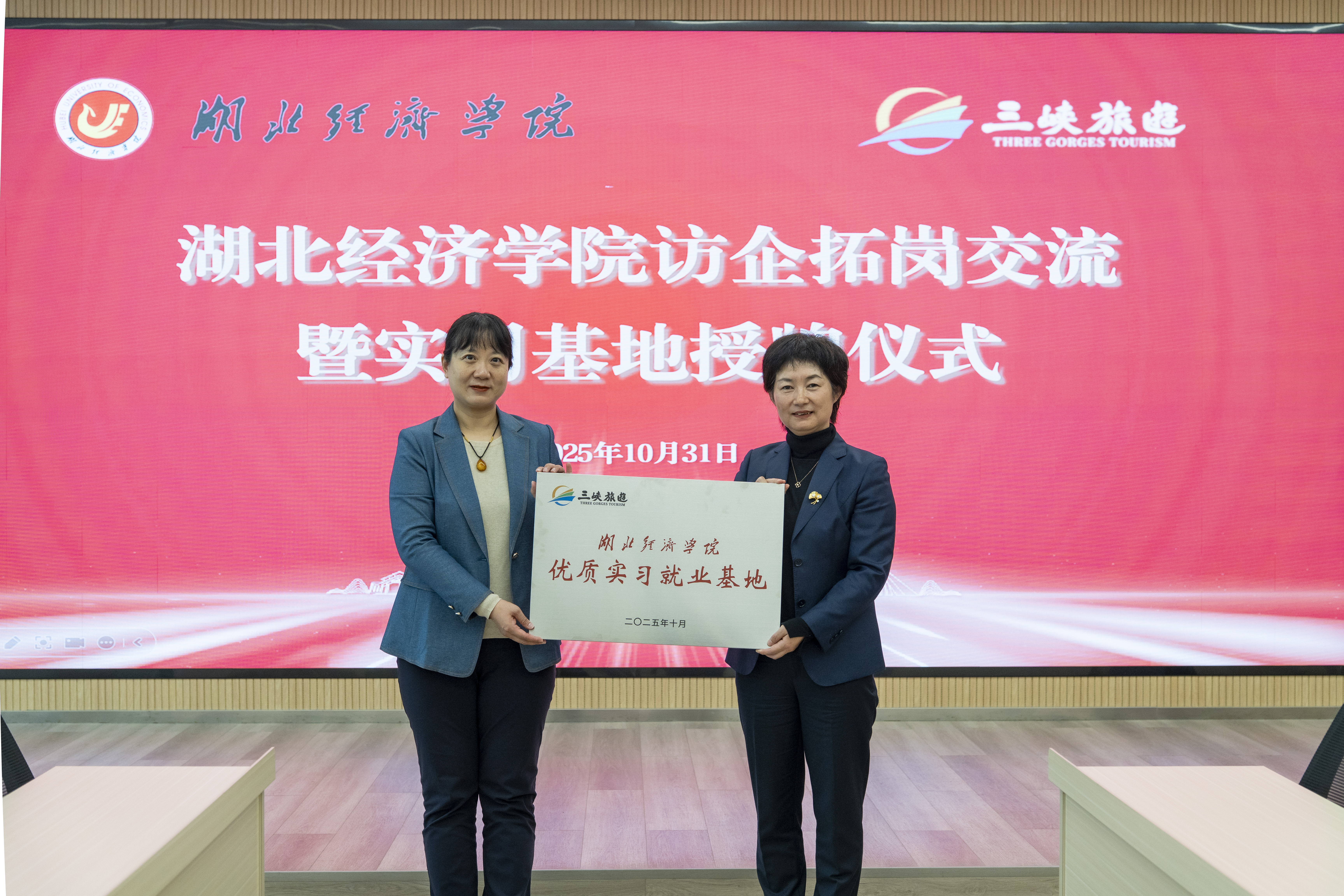 10月31日,毛焱一行走访位于宜昌市的湖北三峡旅游集团股份有限公司(简称三峡旅游)。三峡旅游是国有上市企业,近年来在员工实习就业方面与学院有着深入合作,双方保持密切联系。毛焱一行考察了游客中心、游轮项目并与三峡旅游有关负责同志开展了座谈交流。座谈会上,毛焱经理重点介绍了学院研究生教育开展情况,并从项目合作、人员培训、实习就业等方面提出今后加强院企合作的思考。三峡旅游党委副书记、工会主席康莉娟对毛焱一行来访表示欢迎,对学院在员工实习方面给予企业的支持表示感谢,对提出的合作意向一一回应,希望今后扩大院企合作领域,增进合作深度。座谈会后,举行了优质实习就业基地授牌仪式。