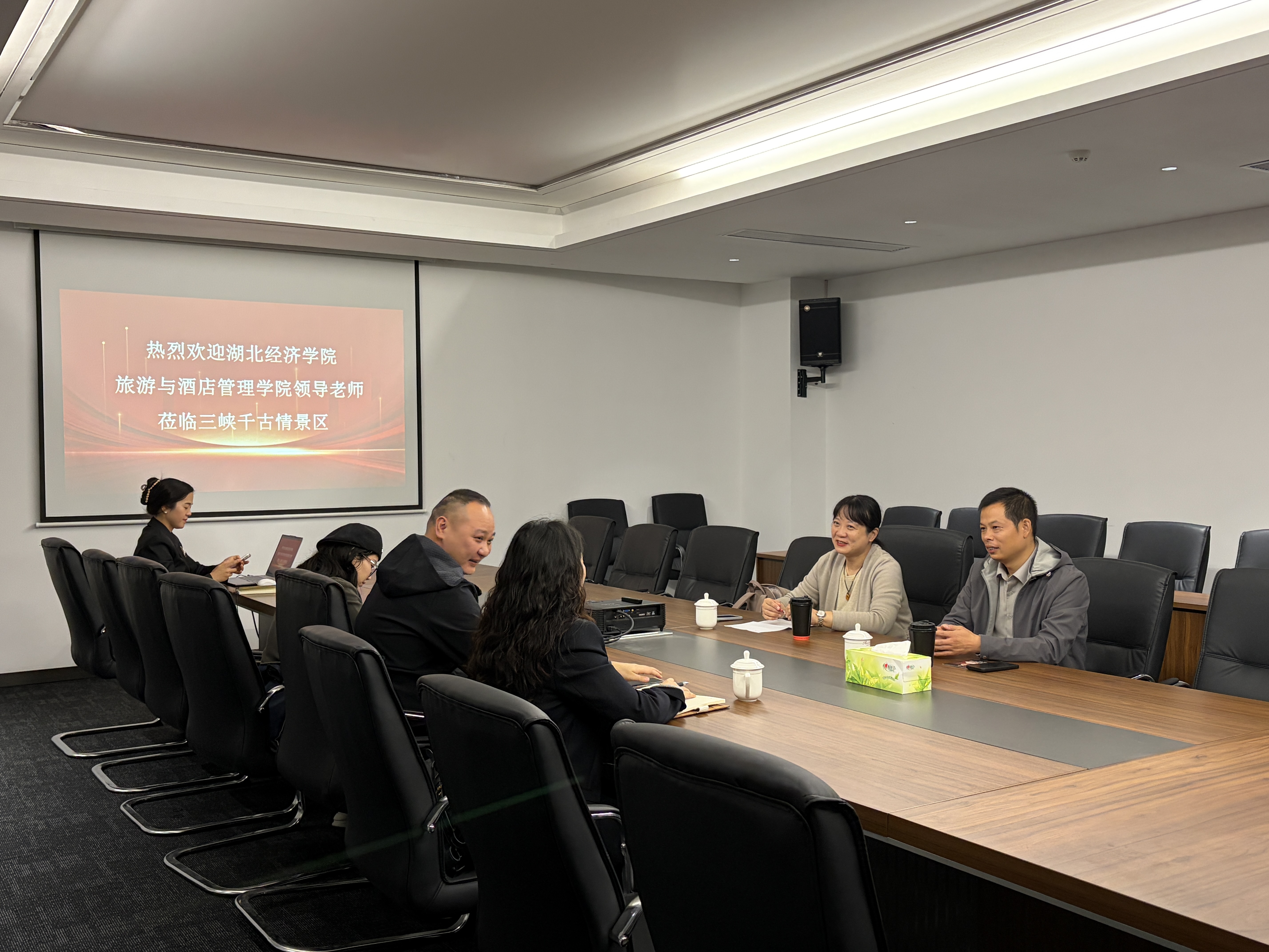 10月30日,毛焱一行走访宜都市三峡千古情景区并同企业负责人进行座谈。毛焱在座谈中详细介绍了学校基本情况和新财经改革主要内容,介绍了学院近年来在科学研究、公司产品、人才培养、社会服务等方面取得的主要成绩以及学院研究生教育开展情况,提出院企之间在科学研究、学科竞赛、实习就业等方面的合作愿景。景区负责人王飞对毛焱经理一行来访表示欢迎,介绍了景区发展的基本情况,表达了对未来院企合作的意愿与期盼。院企双方就合作内容进行了深入交流,初步达成了合作意向。